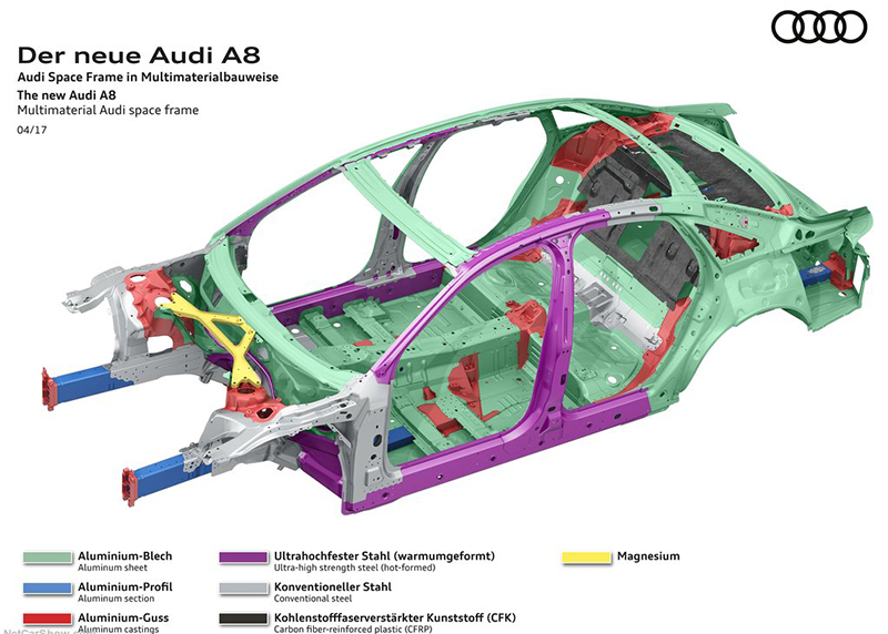 Audi A8 มาพร้อมกับโครงสร้างตัวถังแบบใหม่ ASF : Alumimium Space Frame เป็นการรวมเอาวัสดุถึง 4 ชนิดเข้าไว้ด้วยกัน multi-material construction เพื่อให้โครงสร้างมีน้ำหนักเบา รองรับการให้ตัวได้สูง และ มีความแข็งแรงมากขึ้น ได้แก่