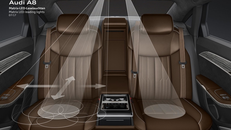 พิเศษสำหรับ Audi A8 L จะติดตั้งที่พักเท้าที่สามารถให้ความอบอุ่นและนวดอัตโนมัติสำหรับผู้โดยสารตอนหลัง, ผู้โดยสารตอนหลังสามารถปรับการตั้งค่าไฟภายในห้องโดยสารได้, ไฟส่องสว่างสำหรับอ่านหนังสือจะเป็นแบบ HD Matrix