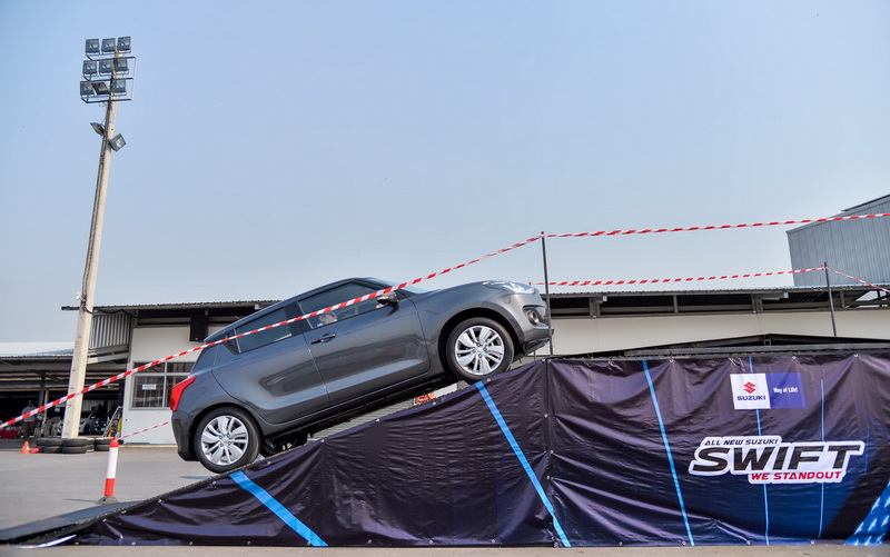 Instructor จะสั่งให้ผู้ขับขี่หยุดรถระหว่างทางขึ้นโดยที่ตัวรถชี้คาหน้าชี้ฟ้าอยู่อย่างนั้น แล้วให้ผู้ขับขี่ยกเท้าออกจากเบรก เพื่อแสดงให้เห็นว่าระบบป้องกันการไหลลงเนินจะช่วยล็อคไม่ให้รถเคลื่อนถอยหลังได้จริง จากนั้นก็จะให้กดคันเร่งแบบค่อยๆป้อนน้ำหนัก เพื่อที่ผู้ขับขี่จะได้สังเกตเห็นว่ารถมีแรงบิดมากพอที่จะไต่ขึ้นเนินแบบนี้ได้โดยไม่ต้องตะบี้ตะบันตอกคันเร่ง ซึ่งจะช่วยให้มั่นใจได้ว่าถนนส่วนใหญ่ในประเทศไทย ถ้าไม่ใช่ว่าชันขั้นเทพจริงๆ Swift ใหม่สามารถเอาตัวรอดได้แม้มีเหตุจำเป็นต้องเบรกจนหยุดระหว่างทางขาขึ้น