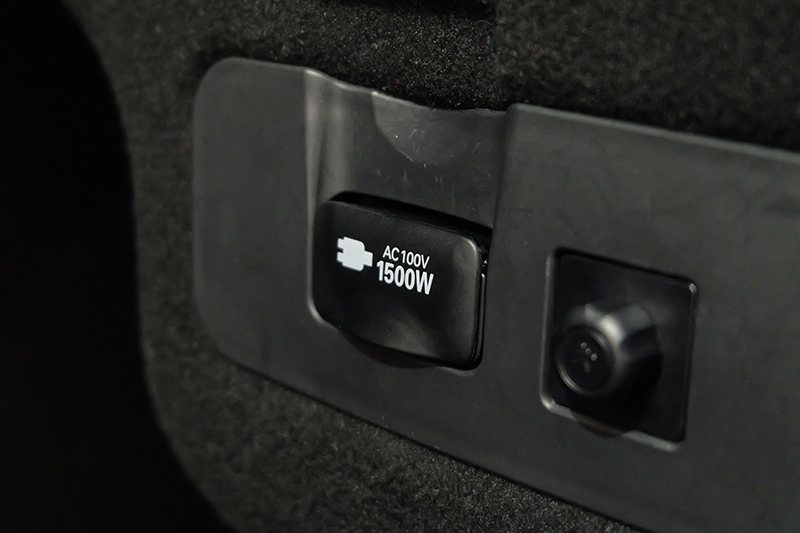 เมื่อยกพื้นรถขึ้นดู พบช่องโฟมสำหรับใส่เครื่องมือประจำรถ และเมื่อยกถาดโฟมออก จะพบยางอะไหล่ของ Dunlop แบบบาง พร้อมกระทะล้อเหล็กสีดำ แถมมาให้ ส่วนผนังด้านข้างฝั่งขวา มีปลั๊กไฟ A 100 V 1,500W มาให้ 1 ตำแหน่ง สำหรับเสียบปลั๊กชาร์จอุปกรณ์ไฟฟ้าต่างๆ ได้