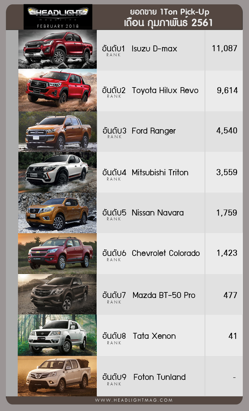 เปิดมาเดือนที่ 2 ของปี 2018 Isuzu ก็ยังคงรักษาอันดับ 1 เอาไว้ได้ต่อเนื่องเป็นเดือนที่ 2 มีการส่งรุ่น Speed / X-Series ตกแต่งพิเศษเอาใจวัยรุ่นออกมากระตุ้นตลาด อ่านข้อมูลได้ที่นี่ >> http://www.headlightmag.com/official-price-isuzu-d-max-speed-x-series-thai/ ส่วนอันดับ 2 ที่ตามมาก็ยังเป็น Toyota Hilux Revo เหมือนเช่นเคย