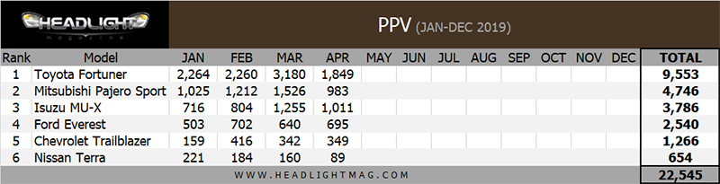 ยอดขายรถยนต์กลุ่ม PPV (SUV พื้นฐานกระบะ) เดือน เมษายน 2562