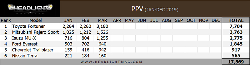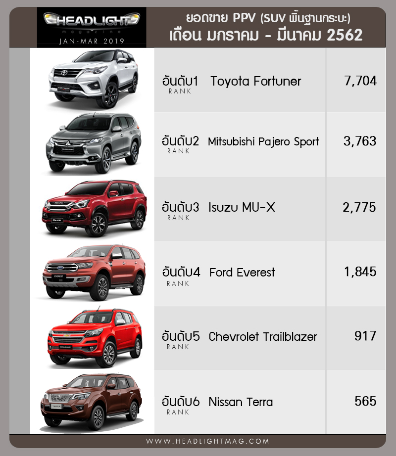 ยอดขายรถยนต์กลุ่ม PPV (SUV พื้นฐานกระบะ) เดือน มกราคม – มีนาคม 2562