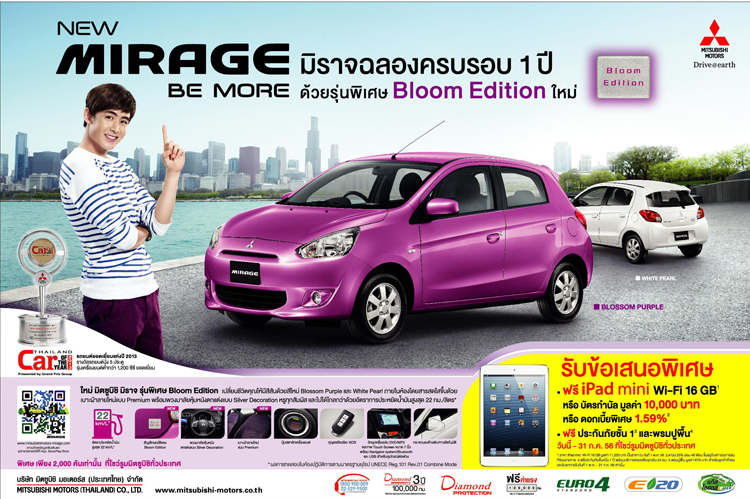 รถมิราจเมื่อปีที่ผ่านมา นอกจากนี้เราจะยังคงจัดกิจกรรมการตลาดในรูปแบบต่างๆ โดยเฉพาะอย่างยิ่งการจัดกิจกรรมโรดโชว์ซึ่งเป็นสิ่งที่เราให้ความสำคัญและดำเนินมาอย่างต่อเนื่อง