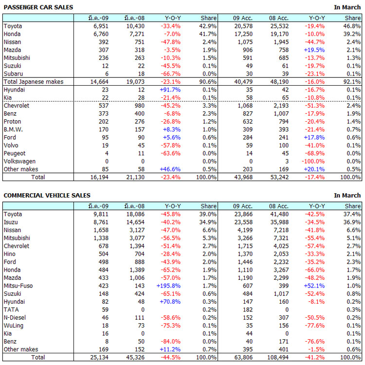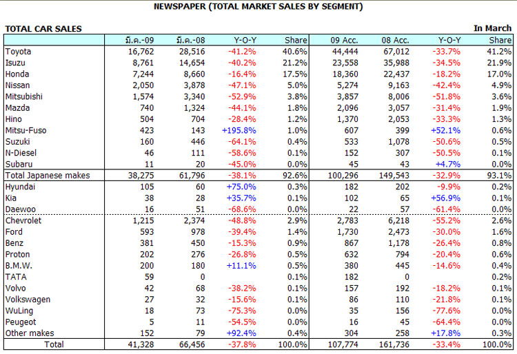 แถลงรายงานสถิติการขายรถยนต์ ประจำเดือนมีนาคม 2552 ปริมาณการขาย 41,328 คัน ลดลง 37.8%