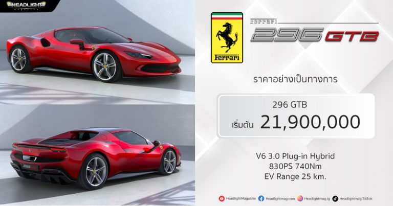 ราคาอย่างเป็นทางการ Ferrari 296 GTB (V6 Plug-in Hybrid) : เริ่มต้น 21,900,000 บาท (นำเข้า CBU)