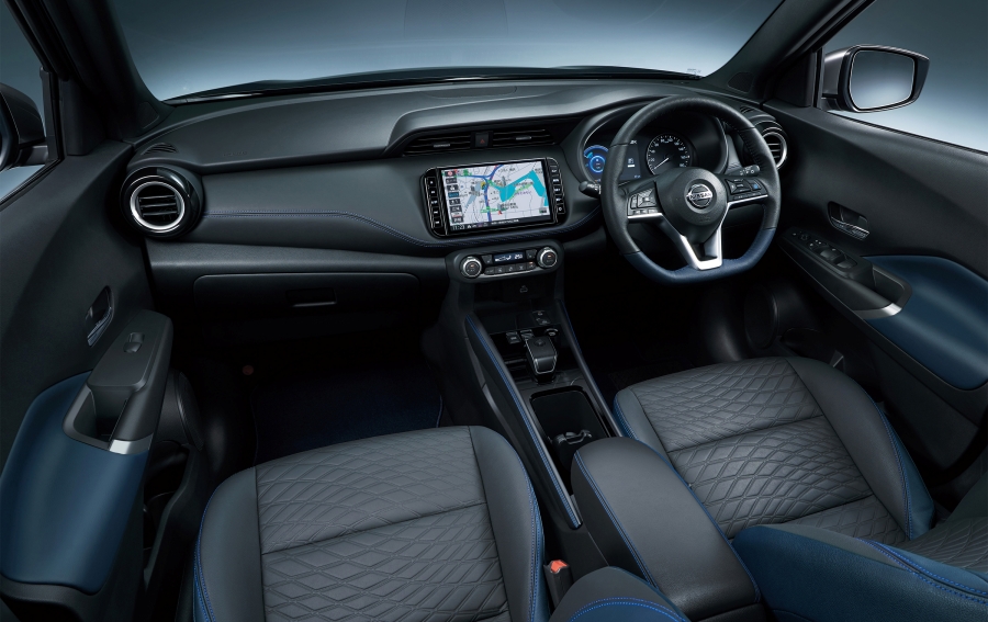 ภายในปรับปรุงคอนโซลเกียร์และเปลี่ยนหัวเกียร์ที่ยกมาจากรถ EV รุ่นล่าสุดของค่ายอย่าง Ariya แบบเดียวกับเวอร์ชั่นไทย แต่ทว่า ไม่มีชุดแต่ง Stylish package (Ambient Light ไฟส่องสว่างที่พักเท้า ไฟ Welcome Light พร้อมโลโก้ “KICKS” ชุดตกแต่งรอบลำโพง ชุดตกแต่งรอบที่ปรับแอร์ ไฟ LED ส่องแผนที่ ไฟ LED ส่องห้องโดยสาร ไฟ LED พื้นที่เก็บสัมภาระ และชุดตกแต่งคอนโซลหน้าและแผงข้างประตูด้วยวัสดุหนังสังเคราะห์สีดำแบบเดินตะเข็บ) ให้เลือกแบบเดียวกับเวอร์ชั่นไทย