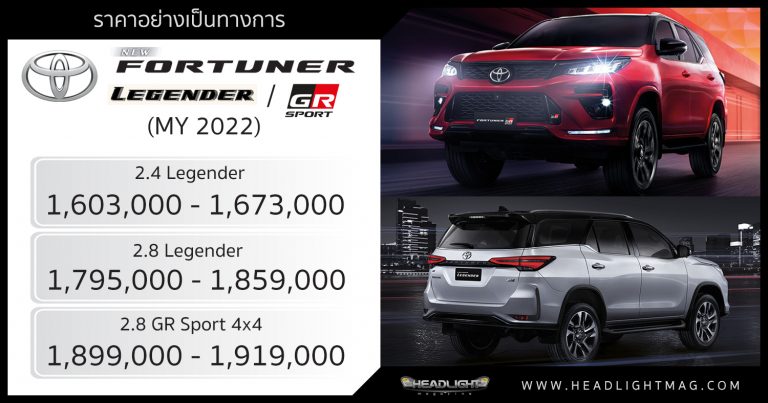 ราคาอย่างเป็นทางการ Toyota Fortuner Legender / GR Sport … อ่านเพิ่มเติม ราคาอย่างเป็นทางการ Toyota Fortuner Legender / GR Sport (MY 2022) : 1,603,000 – 1,919,000 บาท