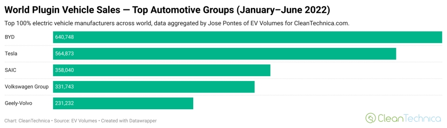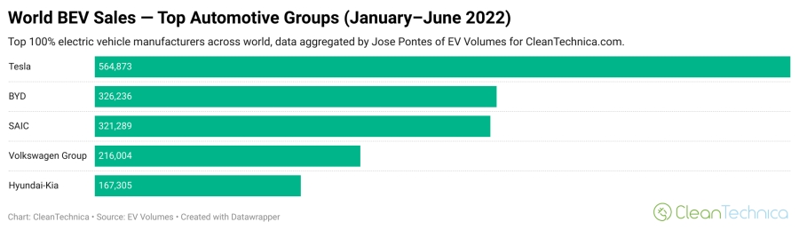 หากพิจารณายอดขายกลุ่มที่ 2 เป็นรถยนต์ที่ใช้พลังงานจากแบตเตอรี่อย่างเดียว จะพบว่าจ่าฝูงยังคงตกเป็นของ Tesla ซึ่งขายรถยนต์ไปรวมกว่ารวมกว่า 564,000 คัน และถึงแม้ตัวเลขจะดูเหมือนมากเมื่อเทียบกับค่ายอื่น แต่นับว่าเป็นอัตราส่วนที่ลดลงถึง 19% เนื่องจาก Tesla ได้รับผลกระทบจากโรงงานในประเทศจีนรวมไปถึง การขาดแคลนเซมิคอนดักเตอร์จากผู้ผลิตชิ้นส่วนจนทำให้การผลิตของ Tesla นั้นผิดแผนไปอย่างสิ้นเชิงในช่วงครึ่งปีแรกของปี 2022 นี้