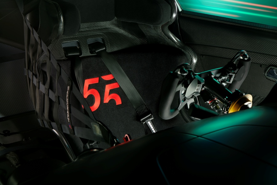 ภายในมาพร้อมรายละเอียดที่ตอกย้ำความเป็นรถแข่งและความหายากของรุ่นพิเศษ ตั้งแต่แผ่นเพลทบ่งบอกความพิเศษ “EDITION 55 – 1 OF 5” ที่บริเวณเบาะนั่งทำจากคาร์บอนน้ำหนักเบา ซึ่งโทนสีที่ใช้ตกแต่งภายในเป็นสีเทาด้าน พร้อมตกแต่งด้วยวัสดุคาร์บอนตามจุดต่างๆ เช่น ขอบประตูด้านใน คอนโซลกลาง และแผงประตู เป็นต้น พร้อมเข็มขัดนิรภัยตกแต่งด้วยทริมสีเงิน