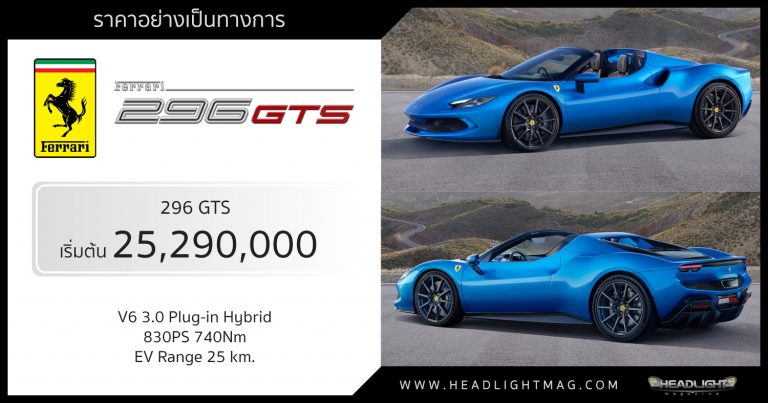 ราคาอย่างเป็นทางการ Ferrari 296 GTS (Retractable Hardto … อ่านเพิ่มเติม ราคาอย่างเป็นทางการ Ferrari 296 GTS V6 Plug-in Hybrid (Retractable Hardtop) : เริ่มต้น 25,290,000 บาท