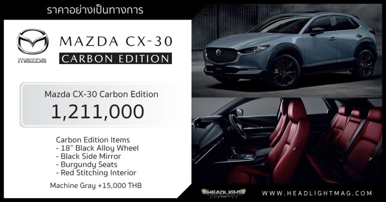 ราคาอย่างเป็นทางการ Mazda CX-30 Carbon Edition CX-30 Ca … อ่านเพิ่มเติม ราคาอย่างเป็นทางการ Mazda CX-30 Carbon Edition : 1,211,000 บาท | สี Machine Gray เพิ่มเงิน 15,000 บาท