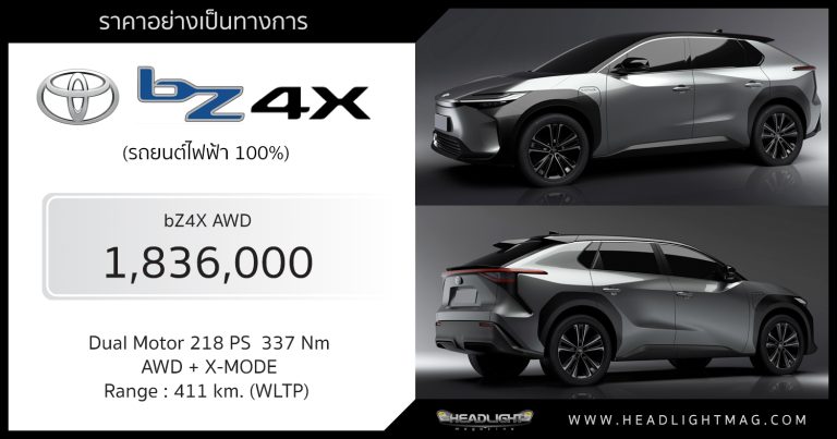 ราคาอย่างเป็นทางการ Toyota bZ4X AWD : 1,836,000 บาท | มอเตอร์คู่ 218 แรงม้า วิ่งได้ไกล 411 km.