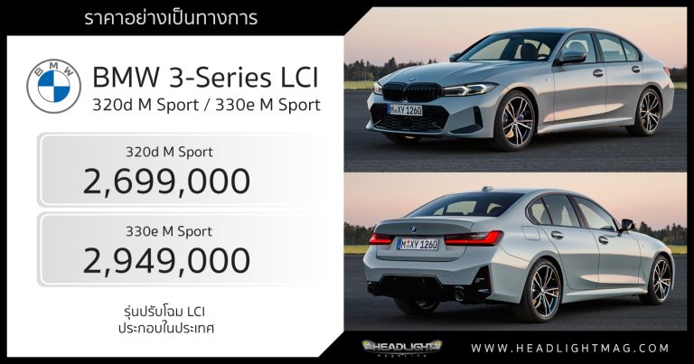 ราคาอย่างเป็นทางการ BMW 320d M Sport / 330e M Sport LCI : 2,699,000 – 2,949,000 บาท (ประกอบในประเทศ)