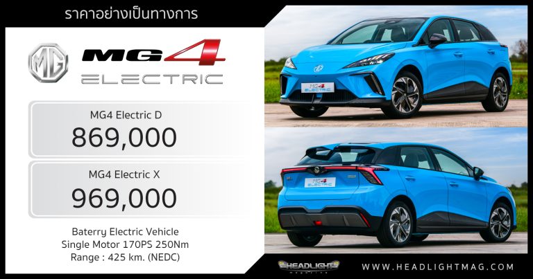 Update / 25 March 2024 MG Sales (Thaialand) ประกาศเปิดต … อ่านเพิ่มเติม ราคาอย่างเป็นทางการ MG 4 Electric : 869,000 – 969,000 บาท | มอเตอร์เดี่ยว 170 แรงม้า วิ่งได้ไกล 425 km.