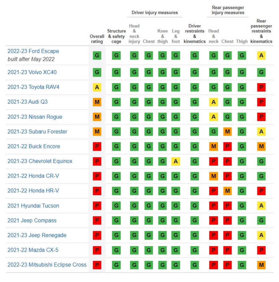 โดยผลการทดสอบรถยนต์กลุ่ม Compact SUV สร้างความเป็นกังวลให้กับ IIHS เนื่องจากมีเพียง 2 รุ่น จาก 15 รุ่น ที่มีผลการทดสอบในระดับดี ได้แก่ Ford Escape และ Volvo XC40 เนื่องจาก ตัว Dummy ได้รับบาดเจ็บเพียงเล็กน้อย และไม่มีผลข้างเคียงจากแรงดึงกลับของเข็มขัดนิรภัย