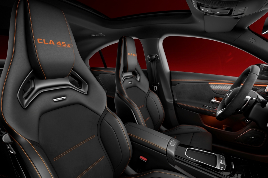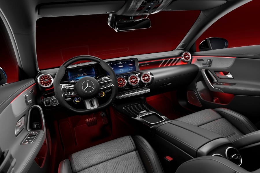 ภายในได้รับการอัพเกรดเช่นเดียวกับรุ่นปกติทั้งเทคโนโลยีระบบ MBUX รวมไปถึงปรับเปลี่ยนวัสดุหุ้มคอนโซลและเบาะนั่ง และเพิ่มเติมไฟตกแต่งภายในห้องโดยสารสีส้ม เข้าชุดกับเบาะ Bucket seat สุดสปอร์ตจาก AMG พร้อมประทับชื่อรุ่นไว้ที่หัวหมอน ในขณะที่พวงมาลัยก็เปลี่ยนมาใช้แบบ 3 ก้านลายใหม่ ติดตั้งปุ่มควบคุมแบบสัมผัสทรงกลมสุดล้ำจำนวน 2 วง เพื่อให้การปรับเปลี่ยนการขับขี่เป็นไปได้ตามต้องการเพียงปลายนิ้วสัมผัส