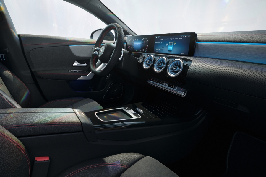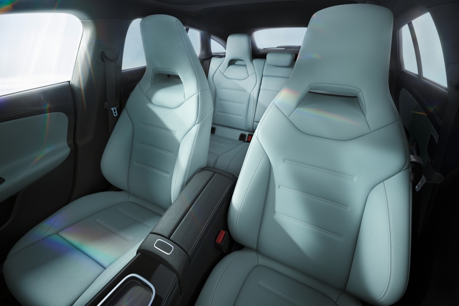 งานออกแบบภายใน มาพร้อมจอมาตรวัดขนาด 10.25 นิ้วเป็นอุปกรณ์มาตรฐาน รวมไปถึงจอกลางที่ทำงานด้วยระบบปฏิบัติการ MBUX รุ่นล่าสุด พร้อมออฟชั่นเครื่องเสียงจาก Burmester ที่ติดตั้งระบบ Dolby Atmos ซึ่งได้ปรับปรุงภาพกราฟิกและหน้าตาของเมนูต่างๆ ให้มีความทันสมัยและสามารถปรับเปลี่ยนตามใจชอบได้มากยิ่งขึ้น นอกจากนี้ ในส่วนของพวงมาลัยหุ้มหนังพร้อมระบบอุ่นสามารถเลือกเป็นอุปกรณ์เสริม พร้อมวัสดุตกแต่งภายในที่เปลี่ยนมาใช้ลายคาร์บอนไฟเบอร์สีเข้ม หรือลายไม้แบบโปร่งสีน้ำตาล ตลอดจนลายกราฟิกสุดทันสมัยเส้นใยสีน้ำตาล