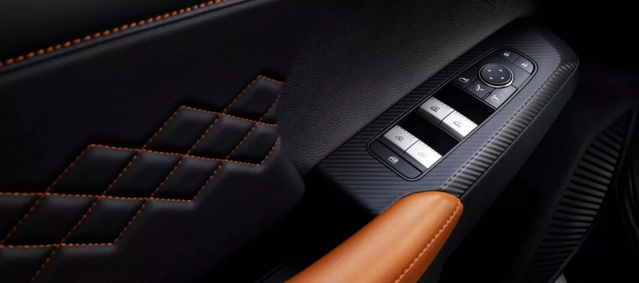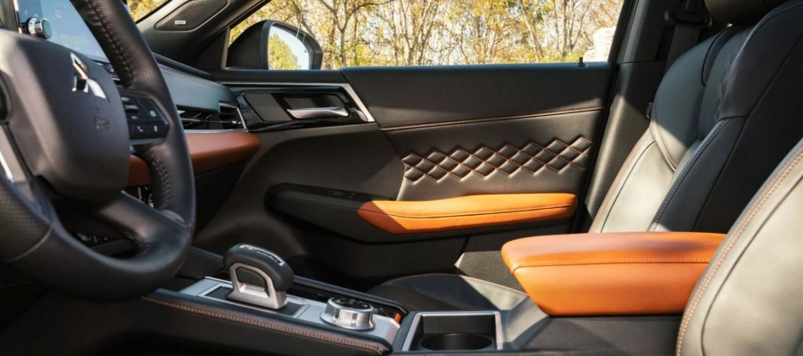 ภายในติดตั้งเบาะนั่งสีดำเดินด้ายสีส้ม พร้อมตกแต่งด้วย หนังสีน้ำตาลอ่อนเพิ่มความหรูหราให้สมฐานะ พร้อมจอกลางระบบ infotainment ขนาด 9 นิ้ว ใหญ่ที่สุดในบรรดารถ Mitsubishi ทุกรุ่น ติดตั้งการเชื่อมต่อ Apple Carplay และ Android Auto แบบไร้สาย พร้อมจอ head-up display แบบสี ขนาดใหญ่จุใจถึง 10.8 นิ้ว ทำงานควบคู่กับจอมาตรวัดขนาด 12.3 นิ้ว