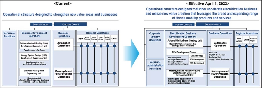 อย่างไรก็ตาม เมื่อพิจารณาทีมวิศวกรภายในองค์กร ที่ทาง Honda ยังไม่เคยเปิดเผยรายละเอียดของทีมรุ่นใหม่ที่ทำงานภายใต้ Honda โดยเฉพาะ จนกระทั่งล่าสุด ทาง Honda ได้เปิดเผยกับสื่อยานยนต์ว่า กำลังรวมทีมพัฒนายานพาหนะขุมพลังไฟฟ้าล้วนโดยเฉพาะ ที่ไม่ได้จำกัดอยู่แค่รถยนต์เท่านั้น โดยมีกำหนดการ Kick off ตั้งแต่เดือนเมษายน 2023 นี้เป็นต้นไป รวมไปถึงมีการปรับแนวทางการบริหารธุรกิจระดับมหภาค ให้สอดรับกับแผนงานการพัฒนารถรุ่นใหม่ๆ ในอนาคต