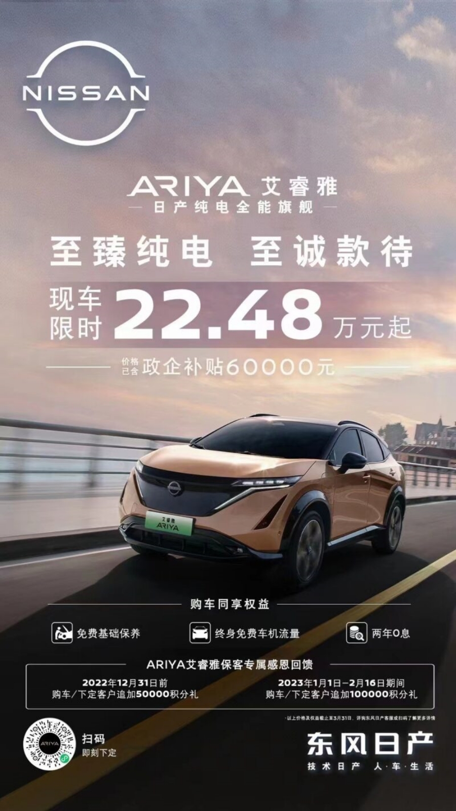 Nissan Ariya วางจำหน่ายตั้งแต่เดือนตุลาคม 2022 ในฐานะรถ EV รุ่นแรกของค่าย เนื่องจากตลาดจีนไม่มี Nissan Leaf วางจำหน่ายทั้ง 2 เจเนอเรชั่น โดยมียอดขายในเดือนมกราคม 2023 ที่ 1,272 คัน ซึ่งคิดเป็นอัตราส่วน 0.08% ของยอดขายรถ EV จากตลาดประเทศจีนทั้งหมดในเดือนมกราคม 2023 ขณะที่สถิติยอดขายในไตรมาสที่ 4 ของปี 2022 ที่ Nissan มียอดขายรถยนต์ขุมพลังไฟฟ้าเป็นสัดส่วนสูงถึง 0.6% ของยอดขายทั้งหมดในประเทศจีน ซึ่งเป็นข้อสังเกตหลัก เนื่องจากอัตราส่วนยอดขายของรถ EV ของค่ายอื่นๆ โดยส่วนใหญ่จะอยู่ที่ 21% ขึ้นไป