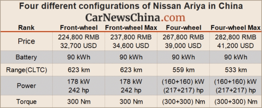 Nissan Ariya เวอร์ชั่นประเทศจีนมาพร้อมขุมพลังทั้งแบบขับเคลื่อน 2 ล้อ และขับเคลื่อน 4 ล้อ ที่มาพร้อมมอเตอร์เดี่ยว ให้กำลังสูงสุด 242 แรงม้า แรงบิดสูงสุด 300 นิวตัน-เมตร และ มอเตอร์คู่รวมเป็น 394 แรงม้า แรงบิดสูงสุด 600 นิวตัน-เมตร ตามลำดับ โดยทั้ง 2 รุ่น ใช้แบตเตอรี่แบบ NMC ขนาด 90 kWh ที่ให้ระยะทางวิ่งสูงสุด 623 กิโลเมตร ในรุ่นมอเตอร์เดี่ยว ขณะที่รุ่นมอเตอร์คู่ให้ระยะทางสูงสุด 559 กิโลเมตร ตามมาตรฐาน CLTC