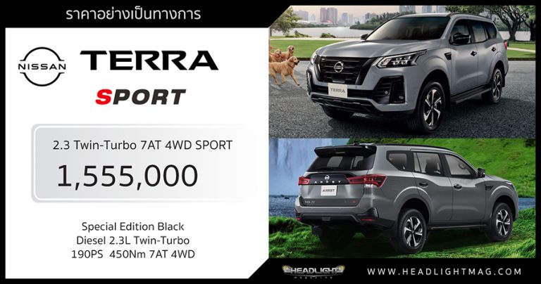 ราคาอย่างเป็นทางการ Nissan Terra SPORT Terra 2.3 Twin-T … อ่านเพิ่มเติม ราคาอย่างเป็นทางการ Nissan Terra SPORT : 1,555,000 บาท | รุ่นตกแต่งพิเศษ โทนสีดำ