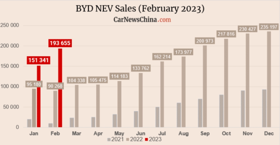 ยอดขาย BYD ในเดือนกุมภาพันธ์ที่ประเทศจีนมีการเติบโตอย่างต่อเนื่อง ด้วยยอดขายกว่า 193,655 คัน โดยแบ่งเป็นยอดขายจากรถ EV เป็นจำนวน 90,639 คัน ทำให้มีส่วนแบ่งยอดขายรถ EV ในกลุ่มรถยนต์พลังงานใหม่ (New Energy Vehicles) เป็นสัดส่วนกว่า 47.3% ซึ่งหากจำแนกยอดขายเฉพาะรถกลุ่ม Plug-in hybrid ที่มียอดขาย 101,025 คัน จะคิดเป็นสัดส่วนมากถึง 52.7%