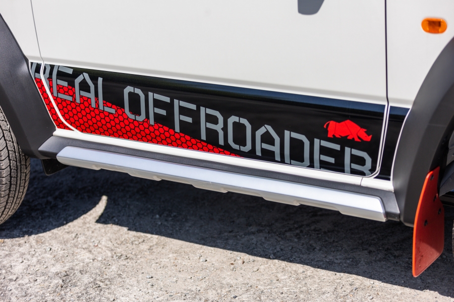 ภายนอกมาพร้อมสีตัวถังสีขาวเพิ่มความโดดเด่นและดุดันด้วยการติดสติ๊กเกอร์สีแด งเทา และดำ ตามบริเวณฝากระโปรงและชายล่างตัวถังด้านข้าง ขณะที่ด้านหลังมีฝาครอบยางอะไหล่ที่เพ้นท์เป็นลายตัวแรดให้สมกับชื่อรุ่นพิเศษนี้ นอกจากนี้ ยังมาพร้อมฝาครอบกระจกมองข้างชุบโครเมี่ยม กระจังหน้าตะแกรงลายถี่ย้อนยุค รวมไปถึงแผ่นกันกระแทกใต้ท้องบริเวณด้านหน้าและพิเศษกับแผ่นบังชุดเฟือง differential ที่ด้านท้าย รวมไปถึงคิ้วกันสาดที่กระจกประตูคู่หน้าและแผ่นบังโคลนออกแบบพิเศษเฉพาะรุ่น