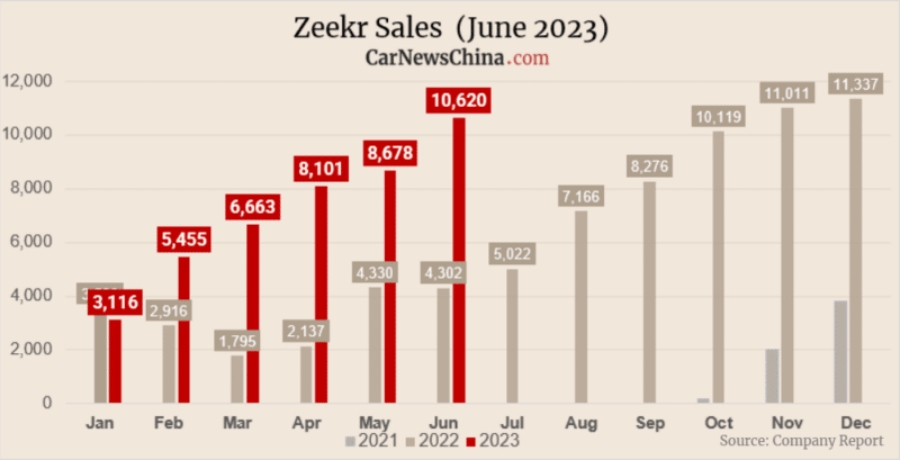 ZEEKR ยังรายงานยอดขายของครึ่งปี 2023 แรก ด้วยจำนวนกว่า 42,633 คัน ซึ่งมากกว่าช่วงเวลาเดียวกันของปี 2022 ที่ขายไปได้เพียง 19,010 คัน คิดเป็นอัตราส่วนการเติบโตกว่า 124%