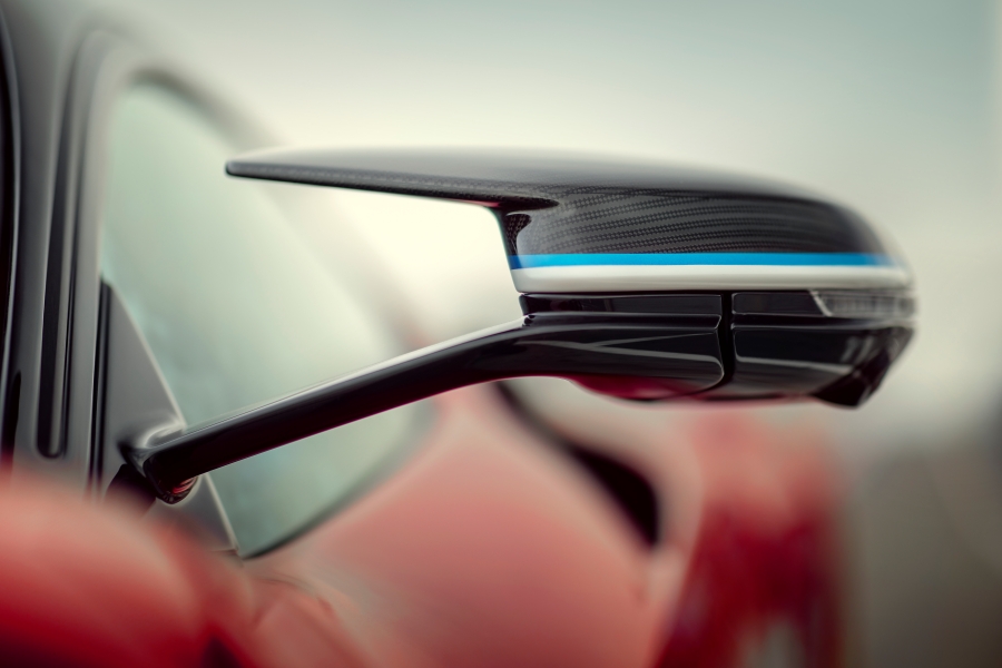 งานออกแบบภายนอกมีการเพิ่มเติมการตกแต่งด้วยสีขาว Bianco Sestriere สไตล์รถแข่ง พร้อมแซมด้วยสีน้ำเงิน Iconia Blu บนพื้นตัวถังสีแดง Rosso Nino และบรรดาวัสดุคาร์บอนไฟเบอร์ที่มีน้ำหนักเบารอบคัน ไม่ว่าจะเป็นกระจกมองข้าง สเกิร์ตรอบคัน หางหลังแบบอัตโนมัติ ปิดท้ายด้วยล้ออัลลอยน้ำหนักเบาสีทอง