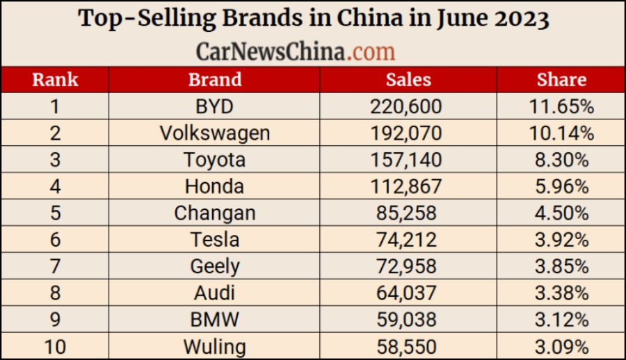 ยอดขายของรถยนต์ส่วนบุคคลในเดือนมิถุนายน 2023 ที่ผ่านมา สะท้อนให้เห็นความรุ่งเรืองของแบรนด์รถยนต์แดนมังกรที่เติบโตอย่างก้าวกระโดด โดยเฉพาะแชมป์ยอดขายอย่าง BYD ที่ขายไปได้มากกว่า 220,600 คัน และคิดเป็นส่วนแบ่งทางการตลาดกว่า 11.65% ตามมาด้วย Volkswagen ค่ายรถยนต์เมืองเบียร์ที่เคยเป็นแชมป์ยอดขายในประเทศจีนเมื่อหลายปีก่อน ก็ขายไปได้มากกว่า 192,070 คัน คิดเป็นส่วนแบ่ง 10.14% และอันดับที่ 3 อย่าง Toyota ที่ขายไปได้จำนวน 157,140 คัน หรือคิดเป็นส่วนแบ่ง 8.30% ปิดท้ายด้วย Honda และ Changan ที่ขายไปได้ 112,867 และ 85,248 คัน คิดเป็นส่วนแบ่งทางการตลาด 5.96% และ 4.50% ตามลำดับ