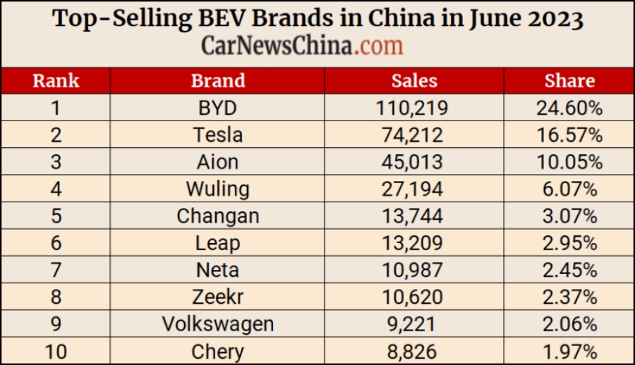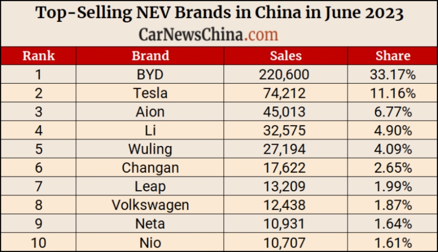 เมื่อหันมาพิจารณายอดขายฝั่งรถยนต์กลุ่มพลังงานใหม่ หรือ New Energy Vehicles (NEVs) จะพบว่า BYD ที่ไม่มีการจำหน่ายรถยนต์เครื่องยนต์สันดาปภายในล้วนมาตั้งแต่แรกจวบจนปัจจุบัน จึงทำให้ภาพลักษณ์ของแบรนด์มีความชัดเจน ส่งผลให้ลูกค้ามีการรับรู้ถึงผลิตภัณฑ์ได้เป็นอย่างดี และก็ยังคงครองตำแหน่งเบอร์ 1 ของตารางประเภทนี้อยู่เช่นเดิม ตามมาด้วย Tesla 74,212 คัน เป็นอันดับที่ 2 และ GAC Aion ที่ขายไปได้มากกว่า 45,013 คัน ในอันดับที่ 3 ส่วนอันดับที่ 4 ได้แก่ Li Auto ที่ขายไปได้จำนวน 32,575 คัน และอันดับที่ 5 Wuling ที่ขายได้มากกว่า 27,194 คัน