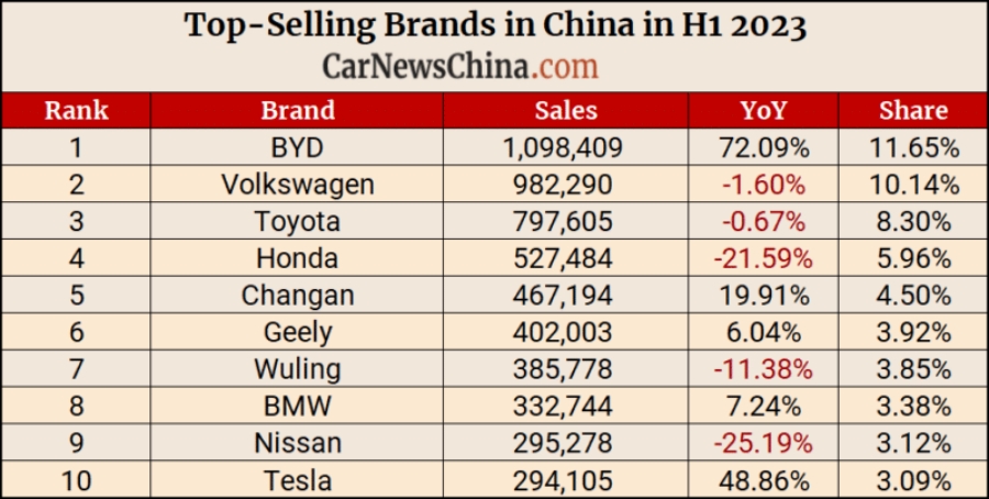 สำหรับแนวโน้มยอดขายในช่วงครึ่งปีแรก รถยนต์เครื่องยนต์สันดาปอย่าง Volkswagen Toyota Honda และ Nissan ถดถอยอย่างต่อเนื่อง โดยที่ยอดขายรวมของบรรดารถยนต์แบรนด์ต่างชาติเริ่มจะโดนแย่งยอดขายจากแบรนด์สัญชาติจีน โดยเฉพาะรถยนต์ขุมพลังไฟฟ้าล้วน