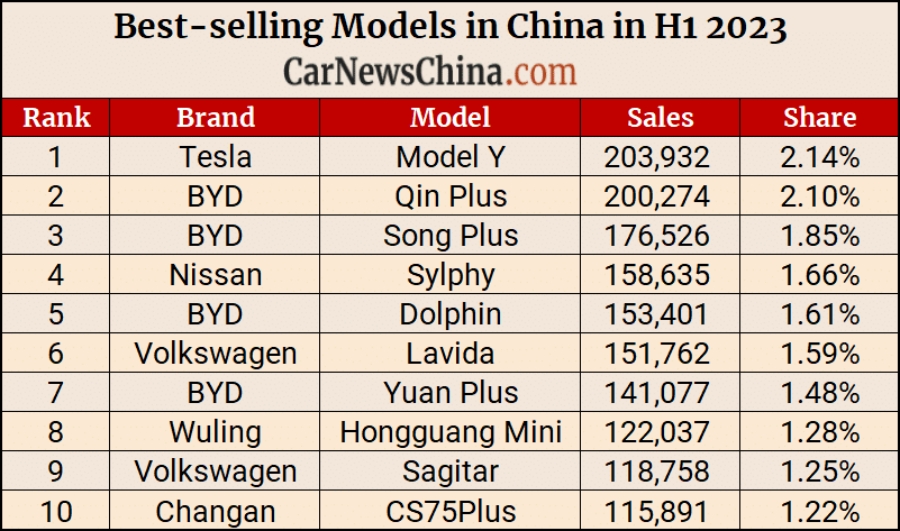 อย่างไรก็ตาม รถยนต์ที่ขายดีที่สุดของครึ่งปีแรกปี 2023 ตกเป็นของ Tesla Model Y กวาดยอดขายไปมากกว่า 203,932 คัน ตามมาด้วย BYD Qin Plus ด้วยยอดขาย 200,274 คัน และ BYD Song Plus ด้วยยอดขายกว่า 176,526 คัน