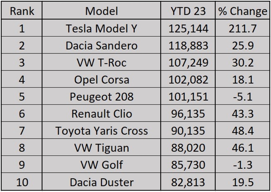 โดยยอดขายของ Tesla Model Y ตลอดช่วงครึ่งปีแรก มีมากกว่า 125,144 คัน คิดเป็นอัตราส่วนเติบโตจากช่วงเวลาเดียวกันของปี 2022 กว่า 211.7% และสำหรับอันดับที่ 2 ได้แก่ รถยนต์ราคาประหยัดขวัญใจชาวยุโรปอย่าง Dacia Sandero ด้วยยอดขายกว่า 118,883 คัน ตามมาด้วยอันดับที่ 3 อย่าง Volkswagen T-Roc crossover ขวัญใจชาวยุโรปด้วยยอดขาย 107,249 คัน แม้จะยังไม่ได้เปิดตัวรุ่น Minorchange ก็ตาม สำหรับรถ Hatchback กลุ่ม B-Segment ยอดนิยมได้แก่ Opel Corsa ที่คว้าอันดับที่ 4 มาครองด้วยยอดขาย 102,082 คัน และอันดับที่ 5 ญาติต่างแบรนด์แต่ใช้งานวิศวกรรมร่วมกันอย่าง Peugeot 208 อีกจำนวนกว่า 101,151 คัน อย่างไรก็ตามกลับมียอดขายรวมลดลงในช่วงเวลาเดียวกันของปี 2022 คิดเป็นอัตราส่วนกว่า 5.1%