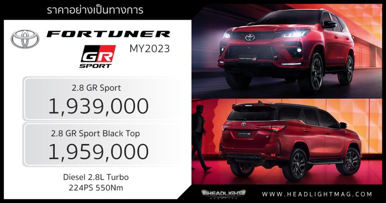 ราคาอย่างเป็นทางการ Toyota Fortuner GR Sport (MY2023) 2 … อ่านเพิ่มเติม ราคาอย่างเป็นทางการ Toyota Fortuner GR Sport (MY2023) : 1,939,000 – 1,959,000 บาท | 224 แรงม้า 550 นิวตันเมตร