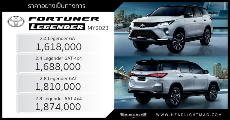 ราคาอย่างเป็นทางการ Toyota Fortuner Legender (MY2023) 2 … อ่านเพิ่มเติม ราคาอย่างเป็นทางการ Toyota Fortuner Legender (MY2023) : 1,618,000 – 1,894,000 บาท | เพิ่ม Apple CarPlay ไร้สาย / TPMS