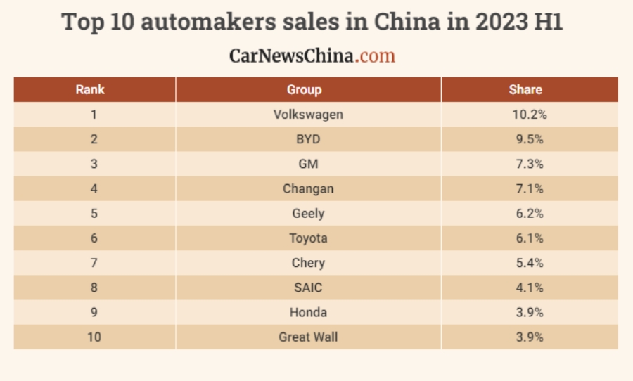ขณะที่ 10 อันดับของผู้ผลิตรถยนต์ในตลาดโลก ได้แก่ Toyota Volkswagen Hyundai-Kia Stellantis Renault-Nissan GM Ford Honda Suzuki และ Mercedes-Benz ขณะที่ในตลาดประเทศจีน 10 อันดับดังกล่าวจะเปลี่ยนเป็น Volkswagen BYD GM Changan Geely Toyota Chery SAIC Honda และ Great Wall สิ่งที่น่าสนใจก็คือ ในตารางแรกแท้จริงแล้วมีอันดับที่ 11 เป็น BYD เนื่องจากยอดขายกำลังมาแรงแซงโค้งจนคาดว่าในอนาคตอันใกล้นี้ อาจจะติด Top 10 ในระดับสากลก็เป็นได้