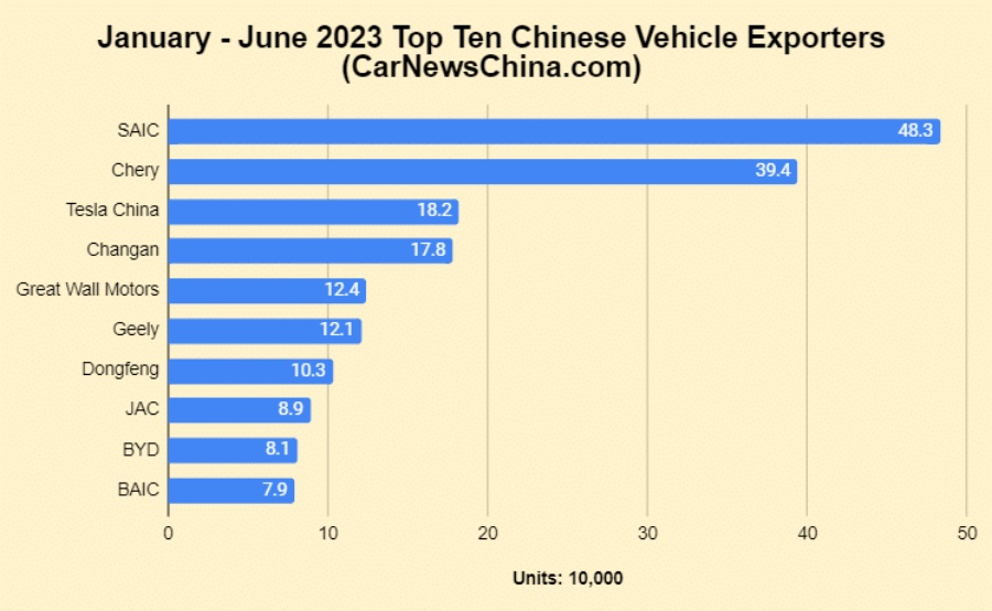 สำหรับ 8 ใน 10 อันดับ ของค่ายรถยนต์สัญชาติจีนที่ส่งออกรถยนต์จากประเทศจีนเป็นจำนวนมากที่สุดจากประเทศจีน ได้แก่ SAIC Chery Changan Great Wall Motors Geely Dongfeng BYD และ BAIC สำหรับอันดับ 1 จากตารางนี้ ได้แก่ SAIC ที่ส่งออกรถยนต์มากกว่า 483,000 คัน ภายใต้แบรนด์ MG เป็นหลัก ด้วยจำนวนกว่า 370,000 คัน โดยตั้งเป้าที่จะส่งออกรถยนต์ให้ได้มากสุดถึง 1.2 ล้านคัน ภายในสิ้นปี 2023 นี้