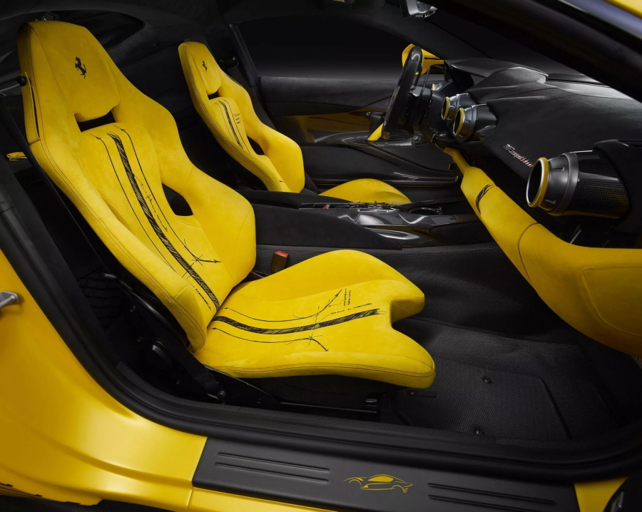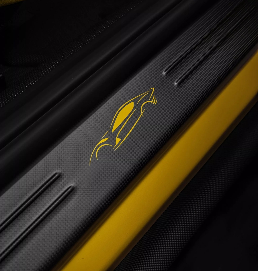 ยิ่งไปกว่านั้น ยังเพิ่มเติมความพิเศษด้วยการออกแบบภายในให้ใช้โทนสีเหลืองสว่าง โดยเฉพาะเบาะนั่งและคอนโซลหน้าทั้งชิ้น ซึ่งตัดกันกับวัสดุคาร์บอนไฟเบอร์สีดำเงาและลวดลายเส้นสีดำที่ถูกประทับลงบนเบาะนั่งที่หุ้มด้วยวัสดุ Alcantara ซึ่งเกิดจากกระบวนการรีไซเคิลในสัดส่วนกว่า 65% พร้อมด้วยพรมปูพื้นลวดลาย trefoil สีดำ