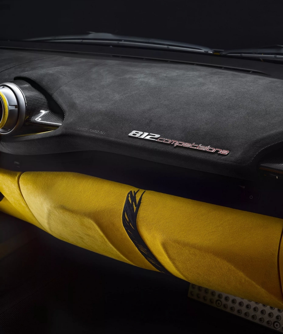ตัวรถเลือกใช้สีเหลืองด้าน matte Giallo Tristrato เป็นพื้นหลัง พร้อมด้วยลายเส้นสีดำชัดเจน เรียกว่าสีดำด้าน matte Nero DS ทำให้เส้นสายของ 812 Competizione ถูกขับออกมาให้โดดเด่นกว่าพื้นผิวปกติ ซึ่งได้รับแรงบันดาลใจมาจากขั้นตอนการรังสรรค์ภาพสเก็ตช์ตัวรถทุกรุ่นของ Ferrari ก่อนที่จะถูกผลิตขึ้นเป็นโมเดลต้นแบบ