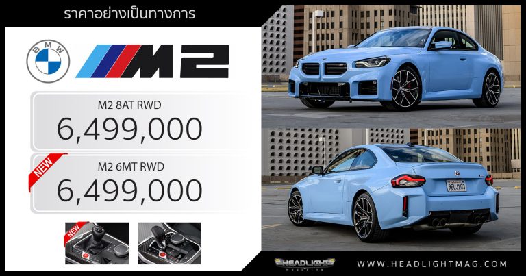 ราคาอย่างเป็นทางการ BMW M2 (MY2023) BMW M2 8AT : 6,499, … อ่านเพิ่มเติม ราคาอย่างเป็นทางการ BMW M2 (MY2023) : 6,499,000 บาท (CBU) เบนซิน 6 สูบ 3.0 ลิตร Turbo 460 แรงม้า 8AT / 6MT