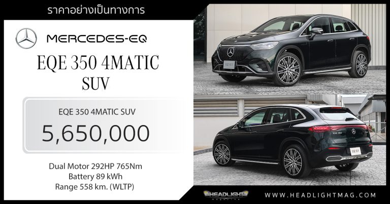 ราคาอย่างเป็นทางการ EQE 350 SUV 4MATIC EQE 350 SUV 4MAT … อ่านเพิ่มเติม ราคาอย่างเป็นทางการ EQE 350 SUV 4MATIC : 5,650,000 บาท (CBU) มอเตอร์คู่ 292 แรงม้า 292 แรงม้า วิ่งไกล 558 km. (WLTP)