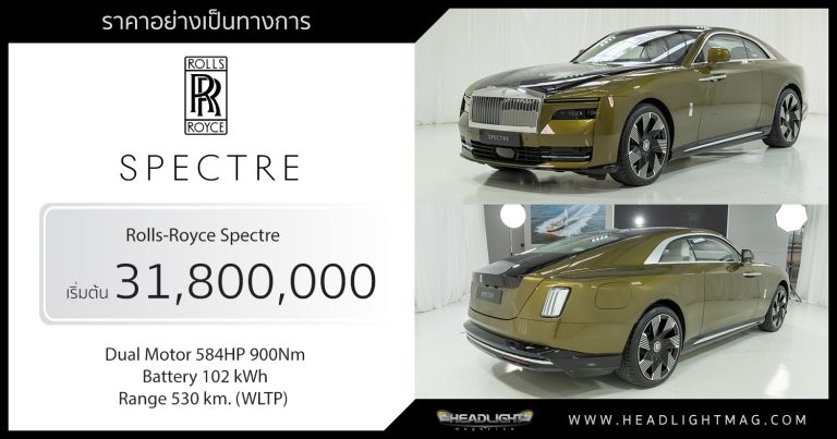 ราคาอย่างเป็นทางการ Rolls-Royce SPECTRE Rolls-Royce Spe … อ่านเพิ่มเติม ราคาอย่างเป็นทางการ Rolls-Royce SPECTRE : เริ่มต้น 31,800,000 บาท | A Rolls-Royce first, and an Electric Car second.