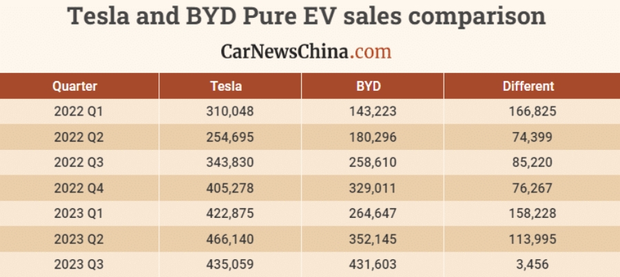 โดยอัตราส่วนยอดขายจำนวนมากขนาดนี้ คิดเป็น 99.21% ของยอดขาย Tesla ในช่วงเวลาเดียวกัน ซึ่งนับว่าเป็นจำนวนที่ห่างน้อยกว่าทุกๆเดือนที่ผ่านมา โดยยอดขายของ BYD ในไตรมาสที่ 3 ของปี 2023 มีจำนวนมากกว่าช่วงเวลาเดียวกันของปี 2022 ถึง 66.9% และ มากกว่าไตรมาสที่ 2 ของปี 2023 อยู่ 22.6%