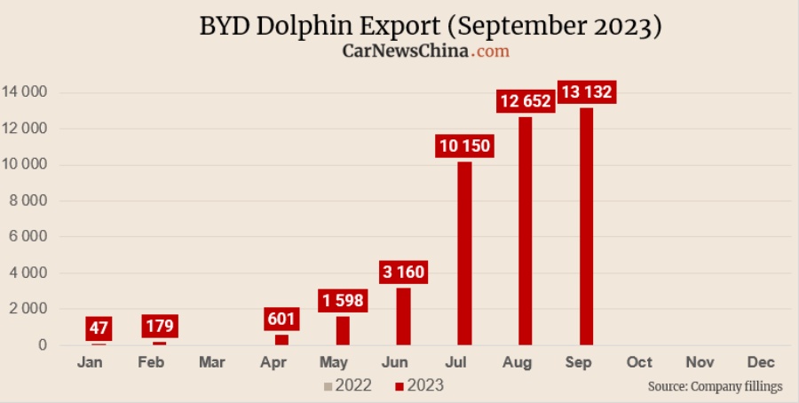 ตลอดระยะเวลา 9 เดือนของปี 2023 BYD ส่งออก Dolphin ไปแล้วกว่า 41,519 คัน โดยส่วนใหญ่แล้วจะเป็นยอดที่เกิดขึ้นตั้งแต่เดือนกรกฎาคมถึงกันยายน 2023 ขณะที่แชมป์ตลอดปี 2023 ยังคงเป็นของรุ่นพี่อย่าง Atto 3 / Yuan Plus ที่เปิดตัวในตลาดนอกบ้านเกิดไปก่อนหน้าและเริ่มส่งออกตั้งแต่ต้นปี 2023 เป็นต้นมา จนทำให้ยอดรวมตลอด 9 เดือน มีจำนวนกว่า 71,957 คัน