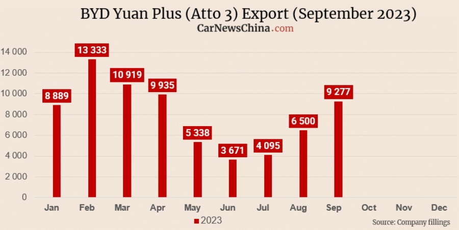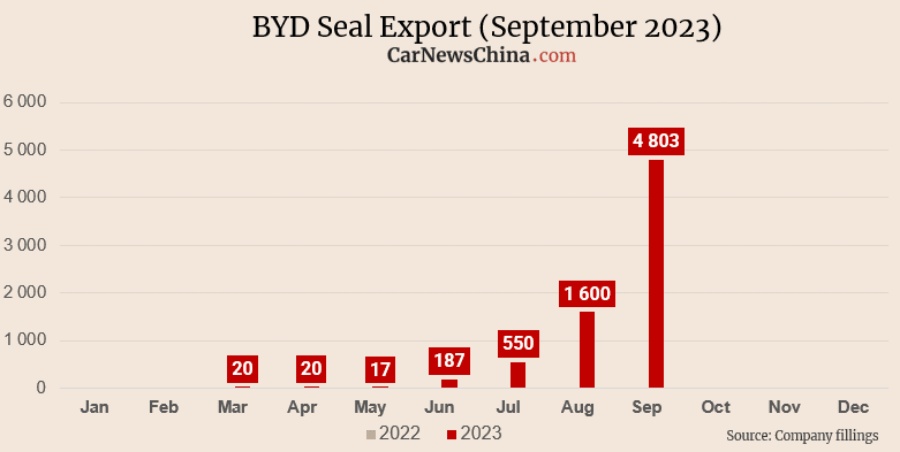 อย่างไรก็ตาม BYD ยังคงมีน้องใหม่ที่ต้องเร่งกำลังส่งออกอย่าง Seal หลังจากเปิดตัวอย่างร้อนแรงในประเทศไทยไปหมาดๆ จนทำให้ยอดส่งออกเพิ่มขึ้นจาก 1,600 คัน ในเดือนสิงหาคม 2023 เป็นจำนวน 4,803 คัน ในเดือนกันยายน 2023 จนสามารถสร้างยอดส่งออกรวมได้เป็นจำนวนกว่า 7,197 คัน ชดเชยกับยอดขายภายในประเทศจีนที่น้อยกว่าเป้าหมายที่คาดการไว้ล่วงหน้า หลังจากคาดว่าจะสามารถเอาชนะ Tesla Model 3 ได้อย่างง่ายดายด้วยกลยุทธ์ราคาจำหน่าย
