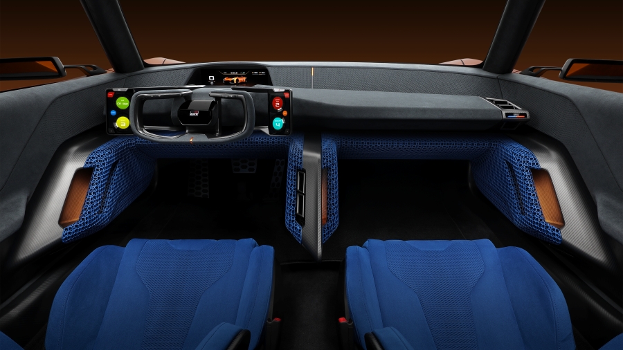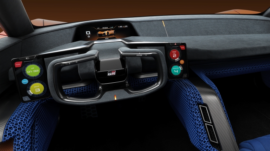 ภายในตัวรถมาพร้อมเบาะนั่งสีน้ำเงิน สุดโดดเด่น พร้อมหน้าจอแสดงผลข้อมูลต่างๆ สไตล์รถแข่ง “น้อยแต่มาก” ครบครันด้วยข้อมูลต่างๆ ของตัวรถ โดยทั้งหมดนี้ถูกออกแบบโดยทีมแข่ง Toyota Gazoo Racing