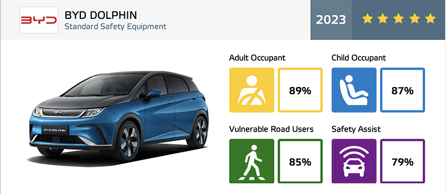 BYD Dolphin เปิดตัวในยุโรปในปี 2023 ได้คะเเนนในประเภท Adult Occupant 89% ส่วน Child Occupant ได้ 87% ในการทดสอบ Vulnerable Road Users ได้ 85% เเละได้ 79% ในการทดสอบ Safety Assist